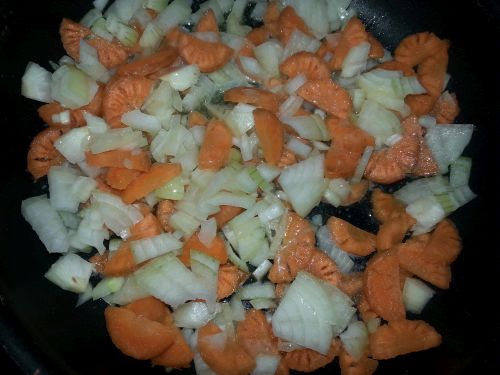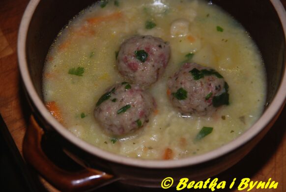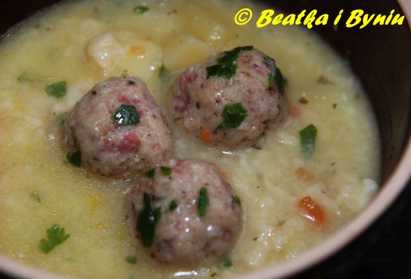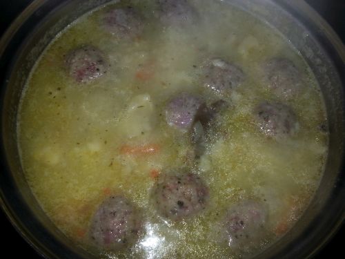 Do tej samej wody z pulpetów dodajemy łyżkę przyprawy do rosołu ( zioła ) liść laurowy, pokrojone w kostkę ziemniaki i gotujemy ok. 10 minut. Cebulę siekamy, marchew kroimy w półplasterki i podsmażamy na maśle do lekkiego zrumienienia się i dodajemy do zupy i gotujemy pod przykryciem ok. 15 min aż warzywa będą miękkie.