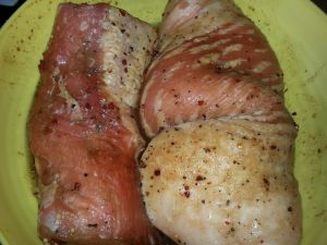 Ser kozi kroimy na cienkie plasterki. Mięso zamarynowane posypujemy roztartym w dłoniach majerankiem. Cienkie plasterki sera ( cieniutkie, tylko dla dodania smaku. Pięknie się roztopią podczas pieczenia) układamy na płacie boczku i zwijamy w roladę i związujemy.
