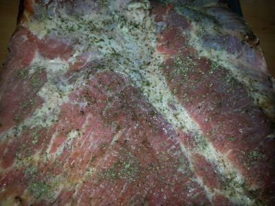 W miarę chudy i spory płat boczku, ten był nie za gruby ok. 2 cm nakłuwamy siekaczem do mięsa lub bardzo ostrym spiczastym nożem. Gęsto. Nacieramy solą ziołową i mieszanką pomidorową, suszoną.
