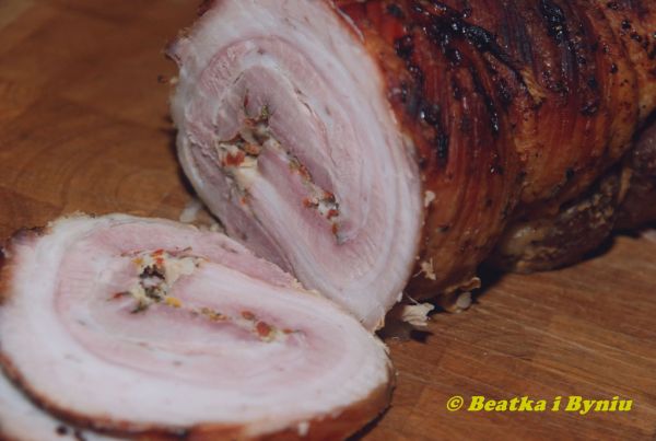 Blaszkę do pieczenia nacieramy dobrze smalcem i wkładamy roladę Wkładamy do nagrzanego piekarnika i pieczemy w temperaturze 170-180 stopni. Czas zależy od wagi mięsa. U nas trwało to około 2 godzin. Upieczony wyciągamy do ostygnięcia. Schłodzony kroimy w plastry i podajemy z pieczywem. Super smakuje z na wpół ukiszonym ogórkiem.