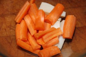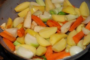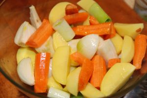 Warzywa obieramy, płuczemy. Marchew i pietruszkę kroimy mniejszą na pół, większą na cztery. Ziemniaki obieramy i kroimy wzdłóż na cztery części. Por kroimy w kawałki ok. 4 cm. Czosnek kroimy na pół. Szalotki kroimy wzdłóż na pół, większe na cztery. Wszystko wrzucamy do miski, skrapiamy oliwą, mieszamy dokładnie aby warzywa były obtoczone w oliwie i odstawiamy na bok.
