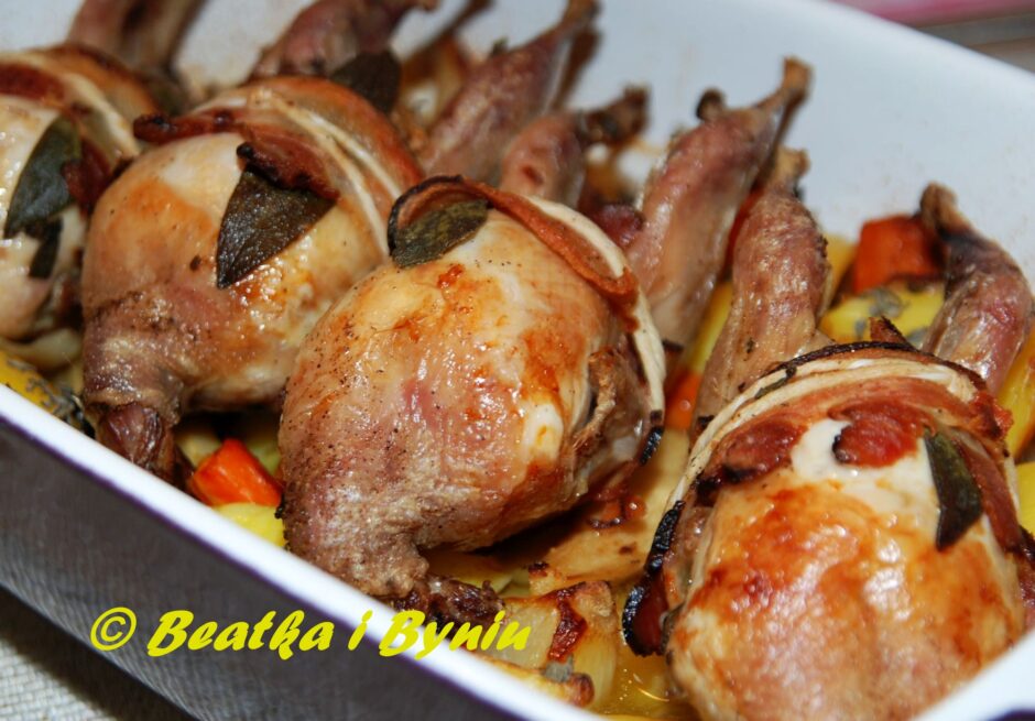 Piekarnik rozgrzewamy do 200 stopni, termoobieg 180 stopni. Do żaroodpornego naczynia przekładamy warzywa z powstałym sosem. Pozostałe liście szałwi siekamy drobno i posypujemy po wierzchu. Na warzywa układamy przepiórki. Wkładamy do piekarnika na 25 - 35 minut.